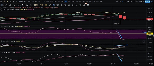 对价格保卫战来说,目前的走势非常不利,空头可能对此感到满意。价格K线下破了布林带4小时中轨2347的支撑线,RSI值下穿并低于中轴线50值,进入了空头区间25以下,空头势力尚未消散。KDJ指标中的J线值反转下行,虽然尚未下穿K线和D线,但趋势正在震荡走低,并在横盘修复中。OBV能量潮,空头势力有望进一步增强,快线下穿周期线将加大释放。预计在平衡期之后,盘中走势可能再次引发空头行情。