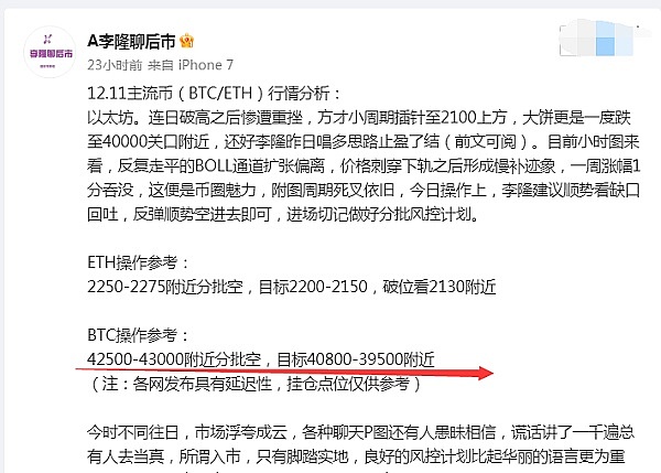 大饼在昨日午间经历了极端的破位和反弹。根据李隆的建议,在42500上方大胆做空,并在午夜最低触及40200附近时获得了2300点的收益。这次交易展现了李隆的实力和精准预判能力。在整个交易中,他表现出理性和稳健的取舍。李隆对于未来的市场也有一些谈论,他认为交易并不难,关键在于坦诚面对现实。