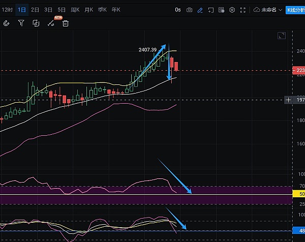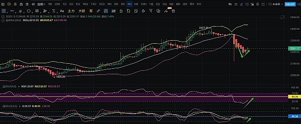 当前4小时走势价格回踩布林带下轨2220击穿最大下行至2156后,多头迎来了一个反弹4小时行情,当前报价于2238附近。暂时性止跌回暖。相对强弱指标RSI当前下行25值后反转上行,技术形态上有超卖反弹迹象。KDJ指标中J线同样出现了空转多迹象,J线拐头上行至K,D周期线附近,未来4小时空间上有止跌震荡上扬需求。