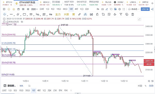 以太坊价格在小时线上已经三次穿越MA450均线,并逐步抬高了低点,形成了一个趋势上即将形成的三角区间。自从价格从约2380美元的高点开始下跌,跌幅达到了250个点以上,但是价格一直在下方区间运行,反弹后都在继续下跌。因此,趋势上偏空,建议在2210-2220美元附近开空仓位,目标看向2150-2100美元。