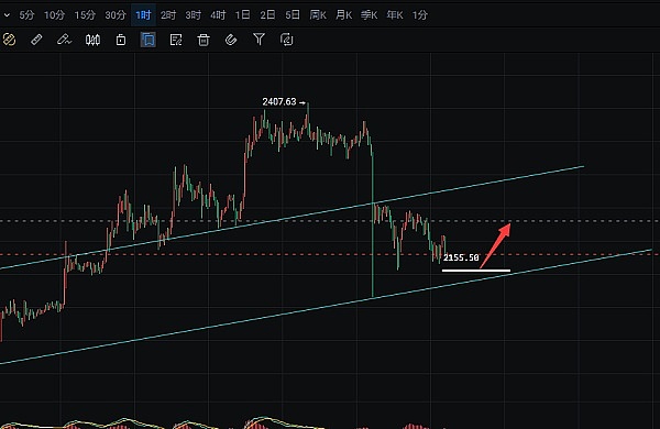 昨日早盘探低之后,以太坊币价在2156附近形成了双针修补,随后出现弱势回踩。尽管短线表现较弱,但目前的走势并未突破前低,下轨失守也得到了快速收回。从图表上看,以太坊开始走粘合调整的走势。