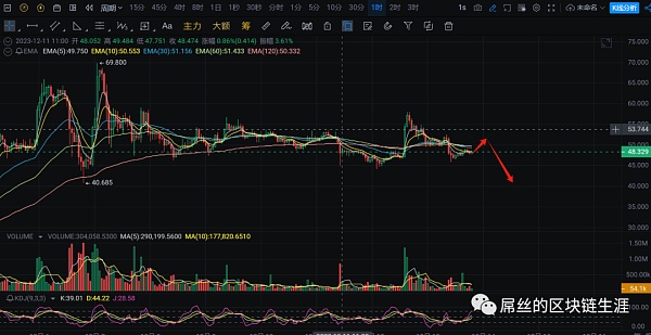 ordi目前从58附近跌到48附近,处于横盘整理阶段。实际上,ordi的走势符合我之前的预测。在四小时图表上,由于时间推移,ma60均线已经上移到46附近,因此出现小的反弹是非常正常的。这也是我在核心群中给出短线多单建议的原因。但从量能来看,我认为ordi的反弹不会很大,之前的44支撑已经失效,需要特别关注46这个位置。如果跌破该位置,估计会进一步触及ma120均线位置40。在小时线上,均线都已经跌破,且下跌过程中都是阴跌形式。需要小心的是,如果小时线一直走阴跌,回调的力度可能会加大。我的建议是:在不破46的情况下可以持有多单,一旦跌破该点,应及时撤退,等待合适的位置再进场较为稳妥。
