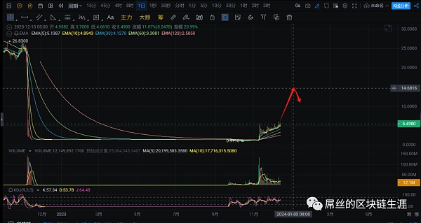 对于FTT,我在4.8附近的核心群中推荐了该币,并建议中长线持有。从消息面来看,FTX破产案的下一次听证会将于12月13日举行。FTX无担保债权人官方委员会对提出的重组计划表示认可。重组计划和披露声明将于12月中旬提交,并提供进一步细节。此外,FTX债务人计划在今年第三季度或第四季度进行销售,并选择一个“首位出价者”。此外,FTX客户已组成投票联盟,超过2亿美元的选票将支持FTX 2.0等计划。从技术面来看,FTT在四小时图表上呈楔形上升形态,量能逐渐增加。结合最近的热度,很有可能突破之前的新高6位置。在小时线上,已突破之前的震荡区间,目前量能还不大。等待放量突破6位置并且站稳后,我认为后续空间很大。我的建议是:现货可以持续持有,如果价格没有跌破5美元,问题不大,目标看到15美元。