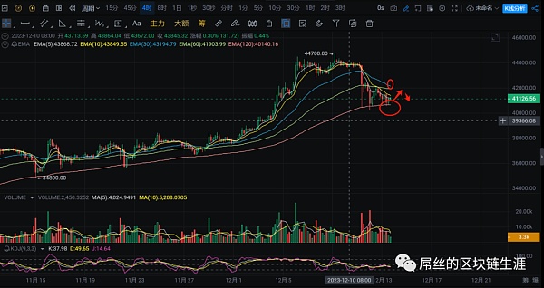 从盘面来看,大饼今天表现出相对弱势。在四小时的图表上,目前的MA120均线一直在试探,但还没有跌破。整体形态上稍显邪恶。我们需要关注42500这个位置,如果短期内没有突破,仍需要保持谨慎。在小时线上,大饼一直受到MA30均线的压制,已经多次试探40500位置,但都成功回升。我认为反弹是必要的,但还需看力度。我的建议是:如果BTC站上42500,可以追涨;如果再次跌破40500,建议持多单先观望,一旦跌破40500,就非常危险。