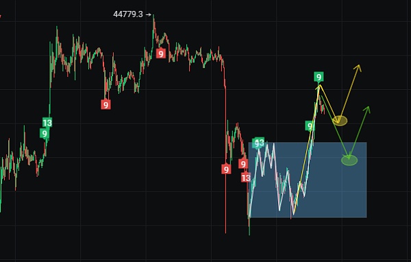 从结构上看,很明显又是一次经典的小转大行情!俗称:V反。12月12日放量暴跌至40222,随后震荡,但是并没有再次击穿40222低点,最低仅回调到40555就又快速拉升。说实话这种小转大V反行情在市场上属于小概率事件,但确是真实存在的。特别容易由消息面引起。