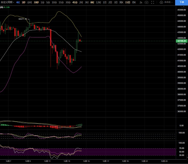 昨日比特币在小幅回踩至4055一线后,白盘整体行情也是处于一个震荡修复运行中,直至晚间多头逐渐发力一路震荡上行,伴随着凌晨消息面的落地多单也是强势上行至43475一线遇阻回落,现行情则在42700附近运行中。昨日我为什么没有写文章,其实也没有什么好写的,而我一直坚守自己的12号写的分析的操作点位,目前都已经达到自己的盈利目标。智多星从不马后炮,可以翻看12号的文章。废话不多说了,咱们看看今日盘面走势情况