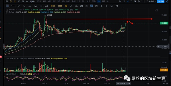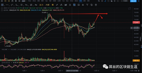 SOL在64位置接到了多单,并且我在核心群也给出了多单建议。从四小时级别来看,MA120均线起到了支撑作用。目前关注上方78的压力位能否有效突破。如果放量站稳并且突破的话,后期涨幅将非常可观。小时线上,MA30均线上穿MA120均线形成均线金叉,量能没有放大,比较温和,后期预计将以震荡上涨为主。我的建议是:低位的多单可以继续持有,短线单可以在77附近止盈。如果放量且站稳78,可以一直持有多单,直至140附近。