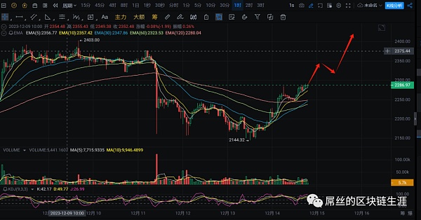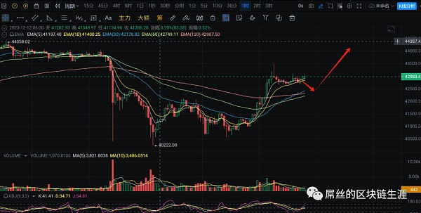昨天,BTC从40500一度拉升到现在43000附近。从日线来看,12月11号当天出现了砸盘阴线,目前还未实现阳包阴,但是均线已经起到了支撑作用。小牛行情仍在持续中,4小时量能温和,小时线的均线全部站上,KDJ指标也由超卖区向超买区转变。形态上也打破了之前的小时线阴跌形态,目前处于横盘震荡状态。MA30均线位置在42300,建议以低多为主。我的建议是:42500附近可以做低多,晚上大概率要冲击44000的压力位,逢低做多。