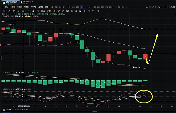 昨天一天震荡的行情,触及下轨后就反弹,目前大饼在42000与西安,以太坊在2240,看小时线BOLL向下运行但是有拐头趋势,MACD将形成金叉,KDJ金叉上行,结合数据分析,早间操作建议回踩看多。