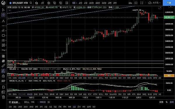 根据最新数据显示,比特币昨日走势较为符合预期,白天盘中呈震荡下行的状态,在最低点附近找到了支撑并形成了小时底背离,之后出现了反弹。恭喜那些跟上昨日思路的交易者,他们的空单获利超过1000个点,还有一部分人能够获得小幅利润。目前,比特币的价格在42300附近徘徊。从四小时级别的图表来看,整体呈现出三角形的盘整形态,价格在区间震荡中上下没有突破。MACD指标显示出双线粘合并且趋势平稳。当前的K线出现了由阴转阳的信号,短期来看,还有一些上涨的空间。然而,从日线级别来看,比特币仍然处于震荡行情没有太大的变化。周末的行情波动较小,依然建议在破位的情况下维持高空低多的策略。上方的压制区间在42600-43000之间,下方的支撑区间在42000-41500之间。