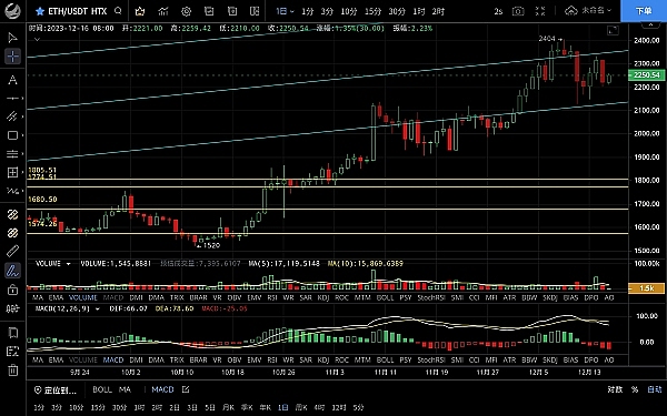 根据最新数据显示,以太坊昨日最高触及到2331一线遇到了阻力,之后整体呈现震荡下行的走势,在最低点附近找到了2201一线的支撑并出现了反弹。恭喜那些跟上昨日思路的交易者,他们能够在多空两个方向上获得合计140个点的收益。目前,以太坊的价格在2250附近徘徊。从四小时级别的图表来看,价格再次下跌到了MA120均线附近,但并没有突破,显示出支撑力度较强。底部方向的K线出现了阳包阴的信号,并且短期受阻而回落。不过预计不会回撤太多。幅图指标显示双线粘合,预计在当天内不会有太大的波动。总体走势的底部逐渐抬高,虽然偏多头,但在当天内破位前高的概率较小。上方关注的压制区间在2260附近,如果不破位的话,可能会再次回落。当天内的走势更有可能是震荡的,因此建议继续采取高空低多的策略。上方的压制区间在2260-2300之间,下方的支撑区间在2220-2200之间。