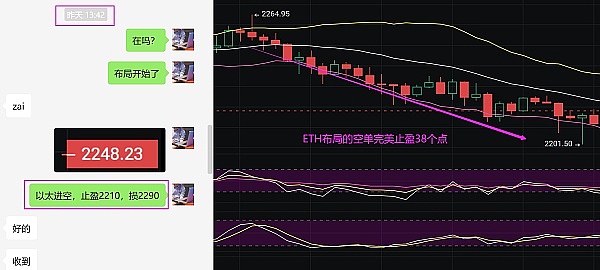 恭喜,金辉给出的布局建议,ETH现价在2248进场空单,完美到达止盈目标2210,止盈38个点,恭喜跟我布局操作的朋友,获利满满!如图:
