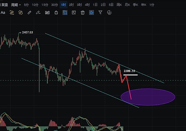以太坊。早盘日线弱势收阴,周末两日延续萎靡整理,币价反复冲高即刻收回,整体空间上有所缩窄,也完全符合李隆强调的高空思路。目前小时图来看,boll通道急剧向下开口,币价多次试探2260附近止涨回撤,可见上行抛售筹码不断释放,附图MACD持续死叉开口,KDJ/RSI相对数值较为平稳,今日操作采取高空不变,进场切记做好分批风控计划。