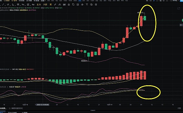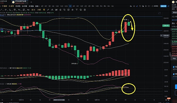 凌晨行情拉升,大饼再次站在43000,以太在2250一线,看小时线,能量柱已经突破BOLL轨道上轨一线,KACD向下拐头,KDJ形成形成死叉,运行在超买区一线,结合数据分析,午间操作建议高位看空。