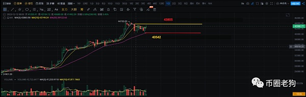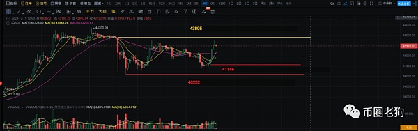 从指标上来看,日线级别MACD金叉只要形成,日线级别的上涨趋势延续,前提是今天日线级别需要站稳均线上方,也就是42363,如果价格没有站稳,短期日线级别下方只要不跌破40542,反弹趋势延续。如果日线级别价格突破了43805,那么大饼价格将继续向年内新高进发。