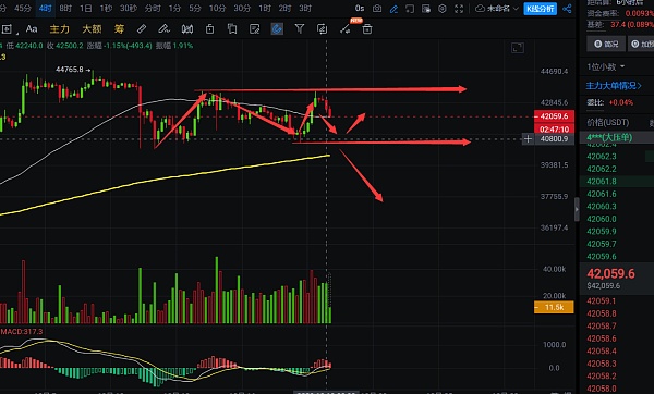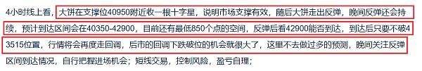 4小时线上看,大饼多头还是比较强,这波短线反弹到达42900附近后日内直接站上,试探短线前高了没有延续上涨,后面行情再度回到42900下方,晚间随后行情开始走下跌,虽然下方下跌目标区间还未到,但是现在去追空利润空间就小了,晚间大饼下跌目标区间在41680-41190,下跌后需关注低点41190能否守住,守不住跌破昨日低点40555,行情将会往39430附近去靠,到达后再去根据收线做布局,大饼晚间还要下跌,自行把握机会,到达支撑看守住的情况,以及下方破位情况;短线交易,控制风险,盈亏自理;