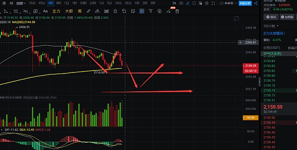 4小时线上看,以太的走势就比较弱了,大饼晚间下跌还未破位,以太晚间跌破昨日低点2115位置的机会更大,昨日的下跌以太就想跌,大饼反弹打破了这一波下跌,今晚以太破位的机会就更大了,跌破2115位置后,以太预计会到达2035附近,到达2035附近后关注收线情况以及大饼的破位情况,如大饼未跌破昨日低点,那短线将会有反弹出现,晚间的下跌自行把握进场机会;短线交易,控制风险,盈亏自理;