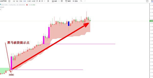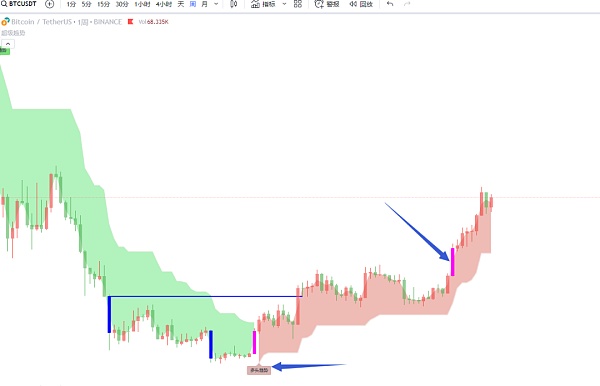 目前市场很强,就是在牛市中,上图是btc周线图,在底部的时候,就出现黄金柱了,粉色的K线,也就是说这里就是底部区域了,这也是为什么,很早就说这里是底部区域,那么我们再看近期,到了10月份下旬,再次出现一根粉色的黄金柱,还是周线级别的,说明牛市启动了,这就是黑马量化的波段大趋势信号;