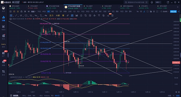 4小时线昨天行情反弹上方下跌趋势线,连续多次反弹受到斐波那契回撤线0.5处2260附近的压制,行情回踩而后走出大跌的走势,凌晨插针下方2145位置后反弹,早间反弹受上方斐波那契回撤线0.236的压制继续回踩,昨天凌晨行情走出V形反转后今天凌晨再次反抽,可以看出随着币价的上涨参与度的增加,波动更大了。行情插针回踩4小时线下轨后反弹,从技术指标上看,价格会有一波小幅反弹上方关注2200-2208的压制。突破再关注上方下跌趋势线2225附近的压制,最近行情呈现大幅波动的走势,白盘会先以震荡为主,晚盘会有更多的行情,整体并未走出下跌的风险。