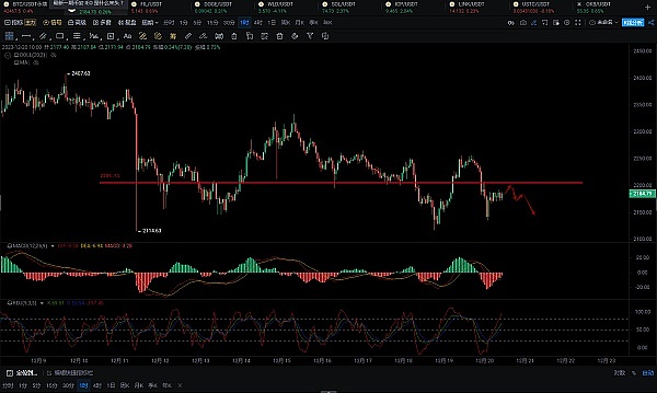 以太走势重心不断下移,日线级别均线逐步向下压制,行情呈现波浪型向下,布林带上下轨横向收口,趋势还没有完全确立,但昨日一根向下的阴线打破了趋势,现在布林带中轨就是压制线。从图形上看MACD指标双线向下发散,空头量能放量,日内逢高做空。小周期以太压制位在2200附近,可以布局空单,目标看到2130—2100.