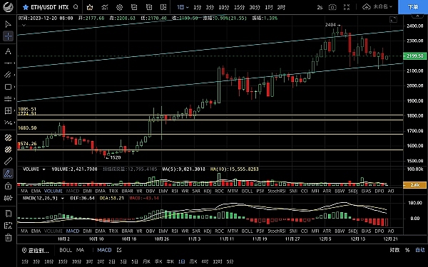 以太坊昨日虽突破前高但2260阻力较强承压再次回落,低位跌至2136一线支撑反弹,恭喜跟上昨日思路的朋友空单获利120点,目前币价在2190附近运行,四小时级别行情下次回踩插针至ma200均线支撑未破,macd无量运行双线呈粘合状态,k线收下影线后连阳反弹,短线来看行情还有上行需求,关注2220区域不破可空,日线级别昨日k线收上影线可见上方阻力较强,同样下方支撑也挺强,两边都没破位,整体在此区间震荡,短线可高空低多操作,趋势操作建议2100不破逢低为主高空为辅,上方压制2220-2260,下方支撑2140-2100