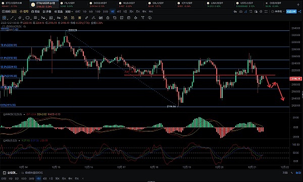 以太币晚间已经回踩小时线下轨,目前准备冲击中轨位置,上方均线层层压制,短期回踩需求明显,建议2200—2215附近空,目标看2135—2110.