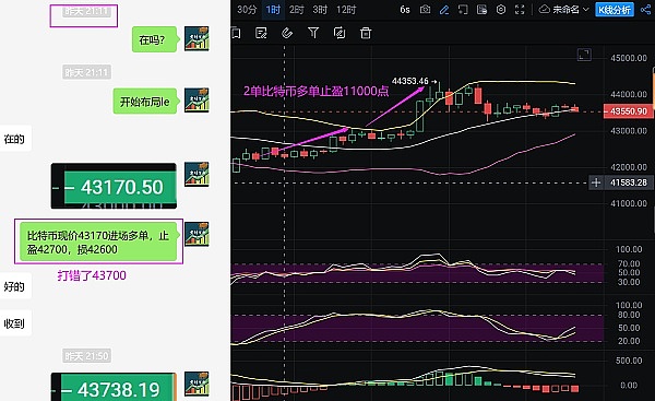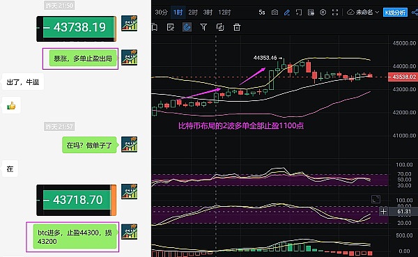第一单:比特币43170的多单完美到达止盈目标43700,止盈530个点,