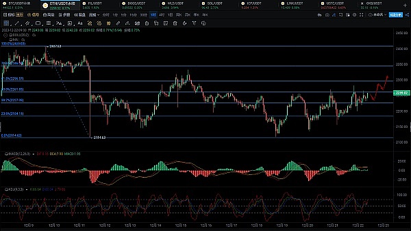 以太各周期均线逐步粘合,多头趋势在开始酝酿,2200—2230都是做多区间,指标方面空头量能缩量,KDJ金叉上扬,白盘建议回踩2230附近多单,目标2300—2350。