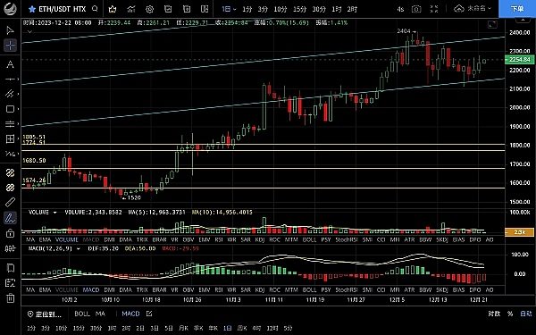 以太坊昨日最低跌至2159一线后迅速反弹,一路上行最高触及2278一线受阻回落,恭喜跟上前低低多思路的朋友,目前币价在2250附近运行,四小时级别整体来看底部逐渐抬高,且每次都破位前高,形成短期上行通道,上方多次试探ma90均线都未有效突破,可见阻力较强,macd呈多头运行双线金叉向上,ma7向上指引,整体走势偏向多头,预计突破的概率较大,日线级别k线收长下影且回踩至ma7均线支撑反弹,若能突破站稳ma14有机会回到2300上方,整体仍是多头走势,思路建议低多为主高空为辅,上方压制2280-2320,下方支撑2220-2200
