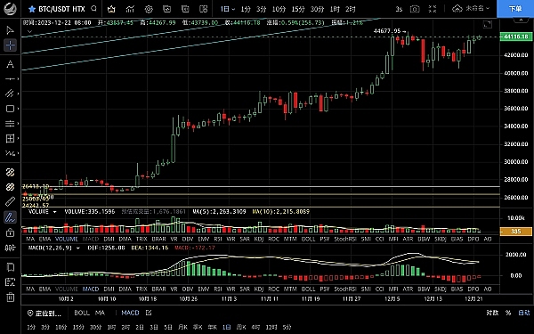 大饼昨日两次试探前高位置都没能突破,随后行情震荡回落低位跌至43370附近支撑反弹,目前币价在43930附近运行,四小时级别行情沿ma14一路上行,整体重新回到均线上方,macd多头运行双线金叉状态,短期来看有再次冲击前高的需求,激进可市价做多,突破前高继续持有,日线级别呈高位震荡走势,整体走势来看突破新高的概率较大,若macd量能不跟后市会形成顶背离结构,到时候就以布局空单为主,日内思路建议低多为主高空为辅,上方压制44500-45000,下方支撑43600-43200