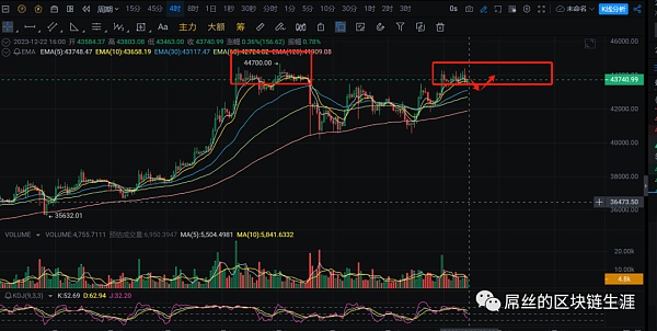 大饼,BTC今天处于一个区间震荡行情当中,日线级别来看,仍然是多头行情,MA30均线支撑住价格往上走,唯一不好的一点是MA120均线目前并没有走上来,均线和价格偏离太远,所以行情随时都有很大的不确定性,4小时看,目前价格全部站上均线,且均线也调整上来,但是目前这个震荡的位置区域,与之前震荡的区域位置属于对称,所以4小时级别不出现放量突破45000,可能回调的可能性还比较高。小时线看,目前价格正处于MA30均线位置,且MA60均线已经支撑住,MA120位置在43000附近,量能目前来看属于一般,所以整体行情还是偏震荡多一点,我的建议是:由于方向是多头趋势,目前还是低多单比较稳,43000附近可以做低多,或者突破45000,去追涨,也是很不错。