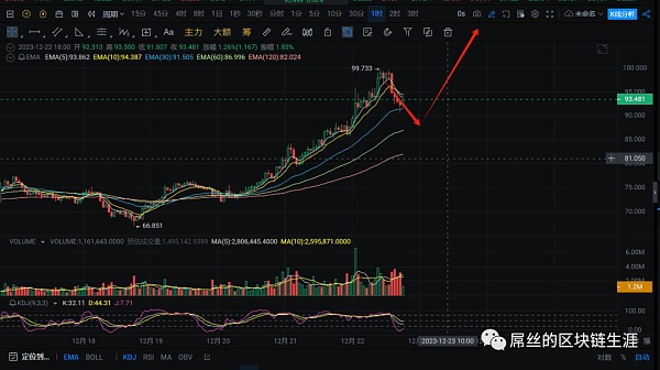 SOL,SOL这个币我之前文章有提到过,今天表现格外出色,也是符合预期的。从日线来看,目前好像要收十字星,但是由于时间没走完,目前我觉得不收复上去,做实体阳线,后面的K线表现也可能一般或者会踩,4小时看,由于之前形态是非常漂亮,价格一直是上涨通道,且已知沿着MA120均线走,今天的话由于加速的过程中,量能并没有跟上,所以导致这里出现回踩是非常有必要的,小时线看,目前已经下跌到MA30均线90位置,如果没有实现跌破,那么可能会继续上冲新高,如果一旦跌破,我认为最佳抄底位置应该再82附近MA120均线位置.所以我的建议是:结合BTC走势看,未出现很大盘面波动的情况下,挂低多单比较稳妥,90,或者82 两个位置都可以尝试一定程度的低多单去做,整体走势还是偏多头一点。