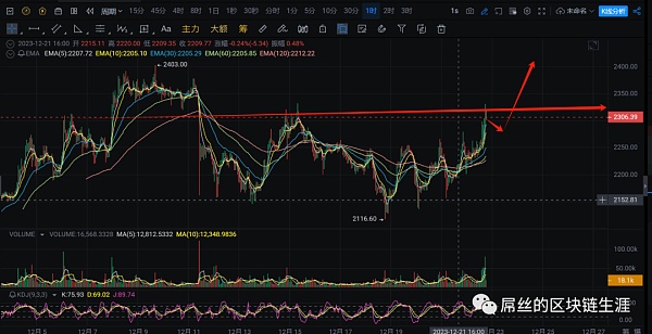 以太,ETH目前价格在2300一带,日线级别均线MA30均线站稳,并且多头散发形态,后期破2400只是时间问题。再来看看ETH/btc的汇率,目前跌至0.05就开始反弹,原因我上次也说过0.05的汇率暂时不容易跌破,后续反弹的概率还是比较大,今天的表现也是相当亮眼,所以后期多单还是建议开以太坊比较合适,4小时级别来看,由于今天的小阳线目前是在2150附近一带出现站稳,并且阳线包含之前阴线,属于行情的反弹信号,我个人认为以太坊破2400的概率还是非常高的,由于目前价格处于4小时布林带中轨,且上轨压力在2380附近,所以且看冲击2400一带的量能是否有效且放大,如果未能实现这种情况,那么回踩中下轨的概率还是很高,且存在的。小时线看,形态上属于打破之前震荡形态,且均线形成MA30线上穿MA120均线形成金叉且向上,但有注意带上一根K有明显的量能放大,且实体大于影线,我认为回踩一下再继续上冲的概率非常大。所以我的建议是:如果有回踩2250附近的机会可以上车,上涨看新高,如果出现放量且站稳,那么以太的时代就会来临,目前还是需要多次确认行情才能明确后期方向,操作上低多为主,一旦突破2400我建议还是看实际情况选择追不追,必须放量且站稳,才有用,否则上轨压力加上KDJ超买区域,容易出现一定程度的回踩。