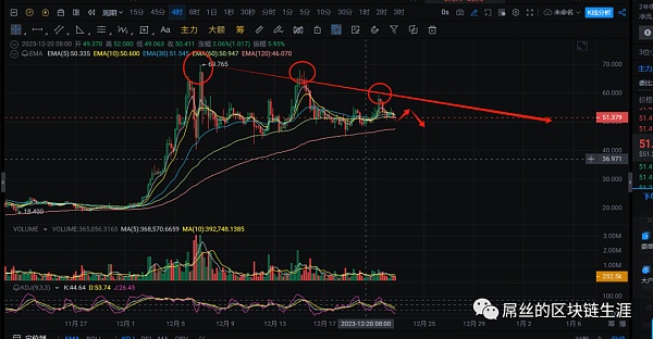 奥迪,ordi,目前报价51附近,首先恭喜之前看了我文章或者在核心群的朋友,再58附近没有去进行追多,而是下车的决定。4小时级别来看,目前有三座大山,如果未能突破,那么跌破目前震荡区域的情况是很大的,分别是58,66,70.所以短时间要想突破是非常困难的,从均线来看,除了MA120均线支撑在48附近,其他均线全部与价格重叠,也是选择方向的时候,量能的话目前处于缩量,短期可能幅度不会太大。小时线看,形态属于阴跌走势,但是已经到达布林带下轨,且KDJ指标也属于超卖区域,短期这个位置反弹一下是存在的,但是力度不大。目前只需要关注48位置即可,我的建议是:持有多单的人,48不破可以试试持有,一旦跌破就严格止损,上方压力58目前短期是很难去的,整体上我不建议持有奥迪现货。