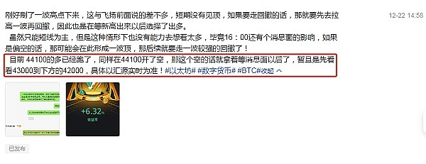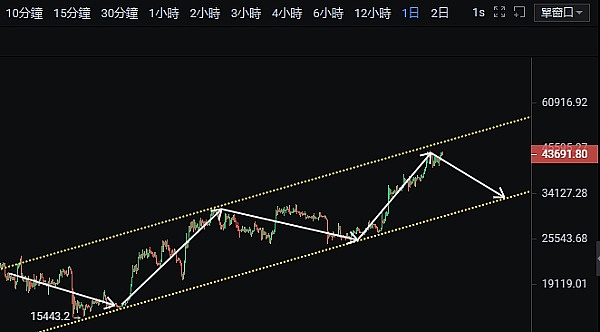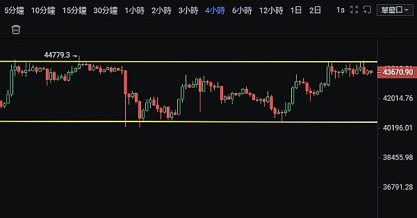 如图②4小时线;4小时其实属于处于高位的一个宽幅震荡区间,区间为上方的44500到下方的40500,但是它短期的回撤又受制于布林带中轨一线的支撑,那也就只有去看小时线小区间的走势能否带动4小时级别的下破。