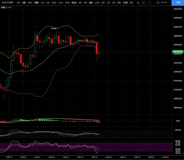 也许是因为周末的关系,也许是因为圣诞节的缘故,交投量大幅缩水,导致整个市场清淡很多,波动更是保持在一个极小的范围内运行,周六日也休息,昨日晚间走势触及44000附近承压回落,以缓慢的振荡下行强势扭转了局面,终在早间爆发,瞬间插针千点空间,同时昨日晚间我也提醒过日线级别没有完全上破,依然要关注下方的支撑!咱们看看今日盘面走势