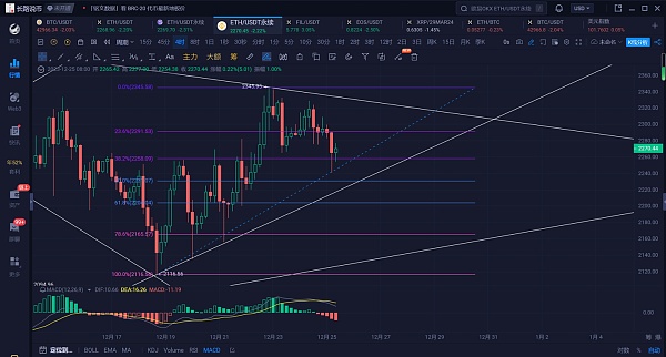 以太坊周末两天也呈现比较大的行情走势,自反弹2348附近高点回踩后,虽有反弹并未突破前高,跌破2300的支撑,早间跌至2240附近才止住跌势反弹,现行情位于2270附近震荡。