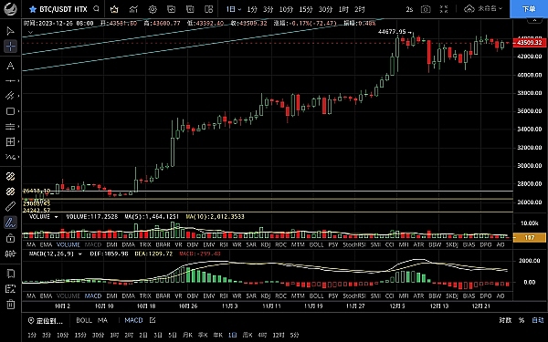 大饼昨日整体呈震荡上行走势,期间价格回踩至43000附近止跌再次反弹,最高触及43800附近受阻回落,恭喜跟上昨日思路的朋友,目前币价在43440附近运行,四小时级别行情止跌反弹拉回起跌点,可见多头支撑力度挺强,macd空头减弱双线死叉状态,短期行情反弹受阻有回落需求,关注ma7支撑情况,若破位则还有下行的需求,日线级别k线收十字星阴线但回踩力度预计不会太大,高位震荡后行情预计会再度迎来走高,低多的单子可继续持有,思路建议逢低做多为主高空为辅,上方压制43800-44400,下方支撑43400-43000