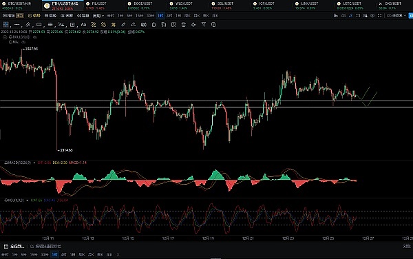 以太的下方支撑区间在2240—2260,这个位置是多头防守位,小时线KDJ指标形成金叉,MACD指标运行于零轴附近,短期大涨大跌概率较小,震荡往下可以逢低作多,2240—2260附近多,目标看50—100点。