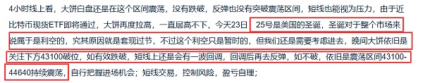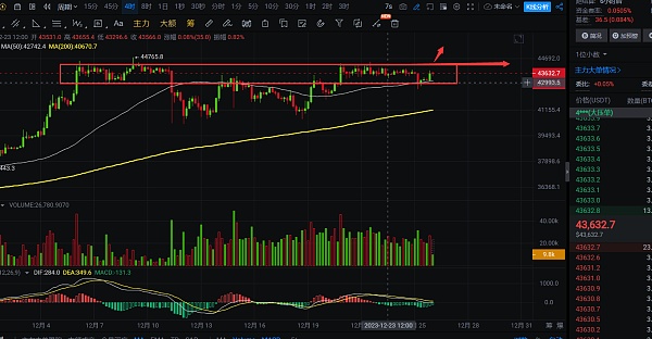 4小时线上看,大饼在小幅下跌后,小破区间低点后日内反弹又回到震荡区间,下跌没有延续,圣诞的下跌预计已经走完了,后面就是比特币现货ETF通过事宜,后市对市场来说就是多头,44765短线高点后市基本是守不住的,目前回到这个区间后,在行情未破之前,依旧是可以去做高空低多的,行情如突破短线高点44444位置,那行情会迎来进一步的反弹,预计反弹高点在45500附近,目前大饼走势依旧是保持区间震荡思路就好,43100-44640区间,有效突破就不去空了,等到达高点后再去考虑布局,自行把握进场机会;短线交易,控制风险,盈亏自理;