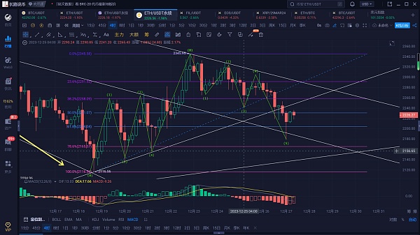 4小时线昨天长路有在视频中给出行情有走出下跌五浪的走势,反弹则关注上涨趋势线2255附近的支撑,突破不了则继续看空,而凌晨的一波下探插针下方密集交易区颈线位置反弹,若是这波下探是5浪延伸浪的浪尾,那么反弹则需要走出ABC三浪反弹浪才能确定上行走势,结合日线和周线级别的下跌趋势,行情这波反弹仍可关注上方上涨趋势线2255附近的压制,若是能突破,那么就有机会回到三角震荡区域内,否则仍会是下跌走势,今天可先以震荡反弹为主,山岗关注2245-2260附近的压制,不突破仍可进场空单。下方则关注2220的支撑,跌破可继续下看。
