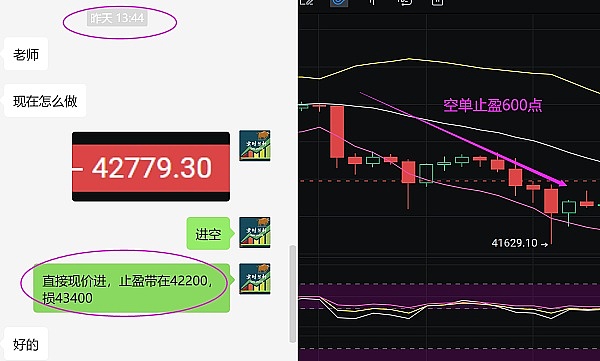 恭喜!行情暴跌,比特币在最高点42779现价布局的空单,完美到达止盈目标42200,止盈600点,恭喜,跟我操作的朋友,如图: