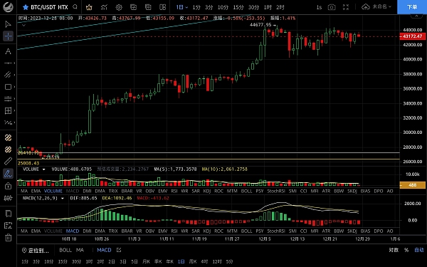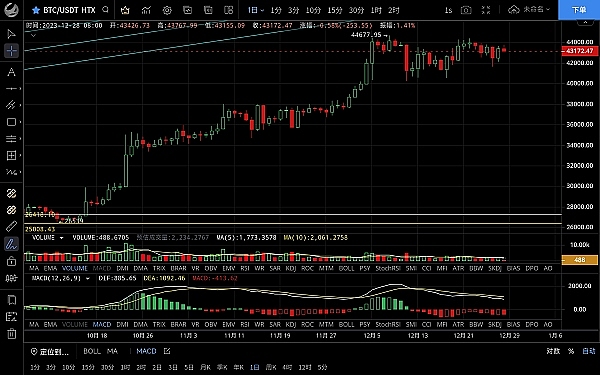 大饼昨日低位回踩至42100一线支撑,随后行情一路反弹上行,最高触及43760附近受阻回落,恭喜跟上昨日思路的朋友,多单获利1500点,目前币价在43570附近运行,四小时级别行情虽震荡上行但未能突破前高,走势比以太坊弱,整体依旧在高位震荡,macd多头逐步放量双线金叉向上,ma7拐头向上指引,短期走势偏向上行,但临近阻力预计会先回调一波,不破ma30则会继续上行,日线级别来看行情回踩未破ma30多头走势未被打破,若能站稳ma7上方则有机会冲击新高,临近月底波动较大注意做好风控,思路建议回踩低多为主高空为辅,上方压制43800-44400,下方支撑43000-42500