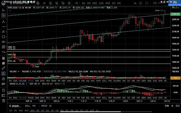以太坊昨日低位回踩至2210一线支撑反弹,行情一路上行突破新高至2444一线受阻回落,恭喜跟上昨日思路的朋友多单获利200点,目前币价在2405附近运行,四小时级别行情磨底后走出六连阳强势反弹,目前k线收上影线受阻走出回踩,但不可盲目做空,短期预计会回踩修复ma均线,下方空间不大,等回踩到位可分批进多,日线级别macd空头转多双线形成金叉,若能收线在2400上方后市则还会再破新高,反之则会震荡修复后再拉高,日内思路建议回踩低多为主高空为辅,上方压制2440-2460,下方支撑2380-2350