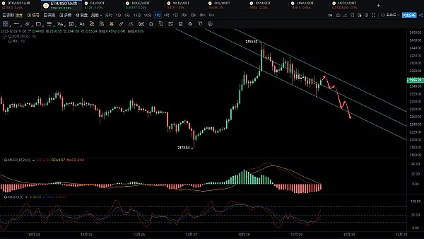 以太的思路和大饼同步,日线目前在上轨严重受阻,昨天还收出插针长上影线,上方套牢和追单的很多,如果没有很大的动能拉升,后面趋势还是回调为主,建议2360附近空,目标看2270—2250.