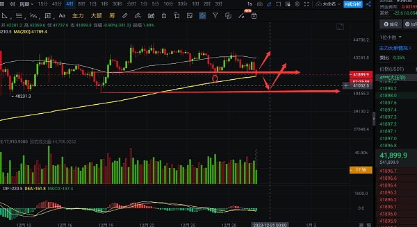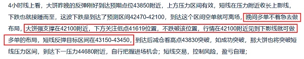 4小时线上看,大饼短线支撑43100附近是被跌破了,目前大饼还未回到支撑位上方去,4小时收线需要等到4点,如收线没有收到42100上方,那晚间跌破短线低点41619的机会也就更大,或许在换线前就会破位,行情一但跌破41619位置,就要开始进一步的下跌,下方短线支撑在40550附近,需要到达这一点位后才能再去布局短线的多,晚间不做多单布局,关注41619破位,如收线收上42100,那就直接反弹,反之破位,将会下跌到40550附近再去反弹,今晚建议先做观望,明日行情明朗再去做布局,自行把握进场机会;短线交易,控制风险,盈亏自理;