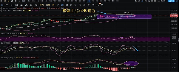 买卖强弱RSI指标趋势线反复在70值区间震荡反转,当前趋势指向相仿50值,多头也由盛转衰日间关注下方2260附近中轨可能面临二次回踩风险,短线抄底追多的仓位可以逢高建仓或出局。KDJ当钱J先下穿K,D周期线,一个下降趋势指向。MACD指标快慢线双线粘连,走势上有横盘整理需求,多,空角力有所平衡。进一步打开行情后大的震荡区间可能会在上方2340--下方2260范围