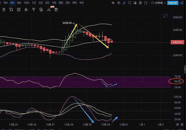 这里看下今天12.30年度最后一天ETH日线级别走势,K线当前在布林带中上轨间呈现出箱体震荡格局,冲高回落后的一个震荡下行的延续。那么日线大级别走势的上方压力位也就是箱体上沿2340附近,今天盘中最大反弹可能也仅限于此点位2340
