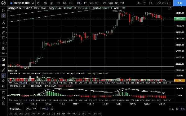 大饼昨日早间最低跌至41260一线支撑反弹,期间二次回落未破前低,行情一路上行最高触及42600附近承压回落,恭喜跟上低多思路的朋友获利1000点,目前币价在42110附近运行,四小时级别行情多次下打ma200均线都未有效跌破走出反弹,上方整体承压于ma30下方,短期k线连阴下跌,活动空间逐渐变窄,macd无量运行双线粘合,周末波动不大预计会持续窄幅震荡,日线级别整体呈震荡走势,高点逐步降低,macd呈空头死叉状态,短线偏向空头,但下方支撑较为强劲,加上年末变数较大,且记带好止损,目前思路建议高空低多对待,上方压制42500-43000,下方支撑41500-41000