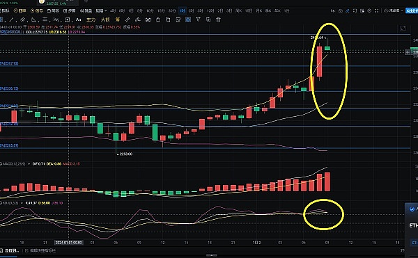 这几天一直横盘震荡的行情在新的一年凌晨突然爆发,大饼达今年新高45500一线,以太坊也达2400一线,看小时线,能量柱已经突破BOLL上轨,MACD金叉上行,KDJ运行在超买区一线,并有拐头下行趋势,结合数据分析,午间操作建议高位看空。